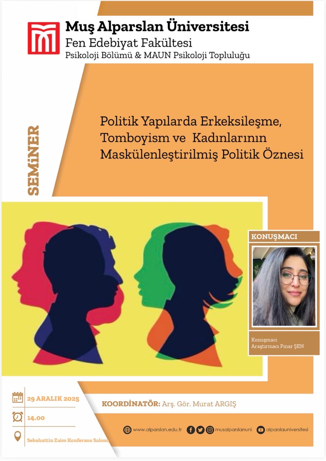 39 Aralık 2025 tarihinde Sabahattin Zaim Konferans Salonu'nda Araştırmacı Pınar ŞEN tarafından "Politik Yapılarda Erkeksileşme, Tomboyism ve Kadınlarının Maskülenleştirilmiş Politik Öznesi" isimli seminer gerçekleştirilecektir.