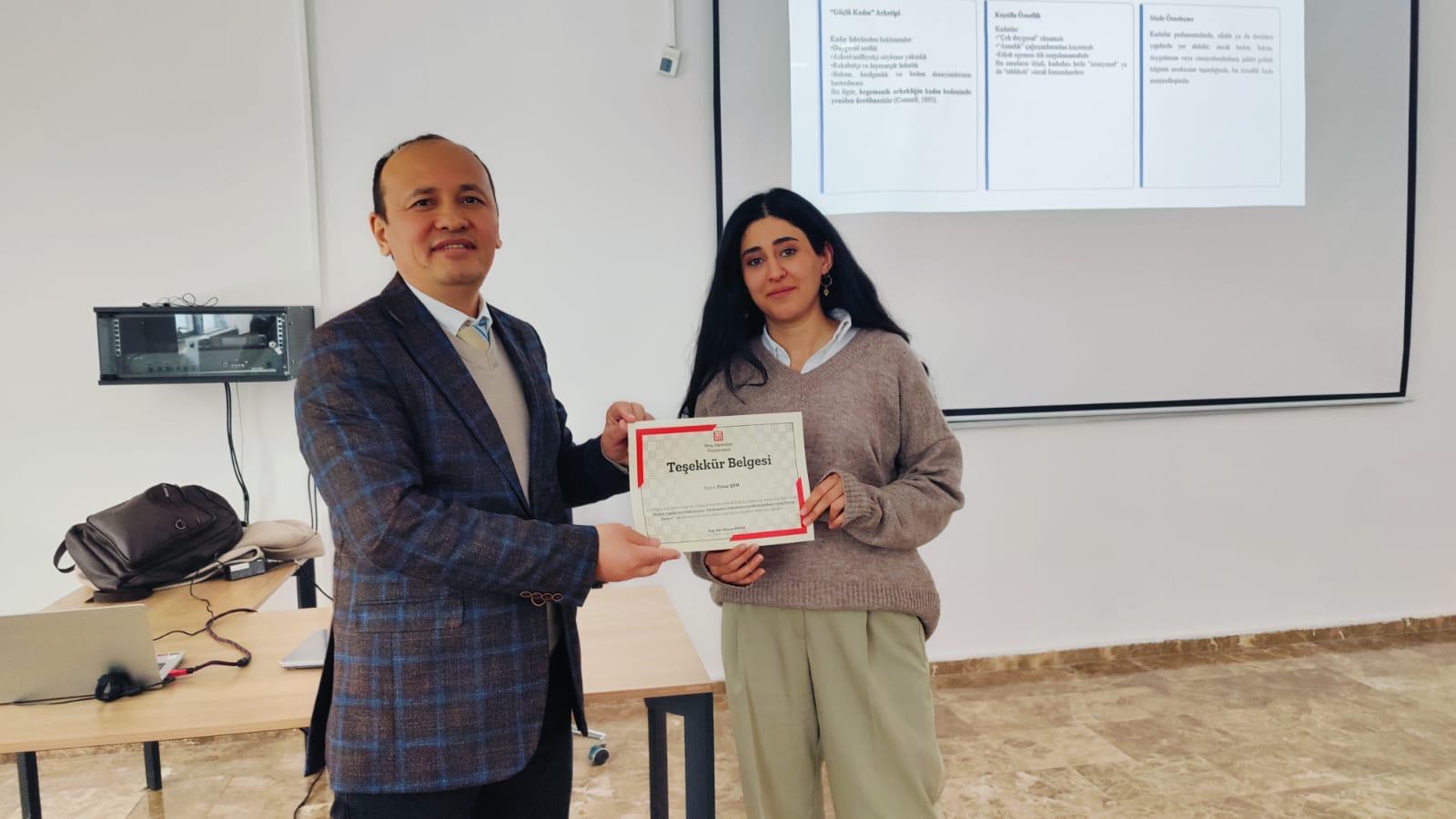 On December 29, 2025, a seminar titled “Masculinization in Political Structures, Tomboyism, and the Masculinized Political Subject of Women” was held at the Sabahattin Zaim Conference Hall by Researcher Pınar ŞEN. A certificate of appreciation was presented to the esteemed speaker by our Dean, Professor Kasım MÜMİNOĞLU.