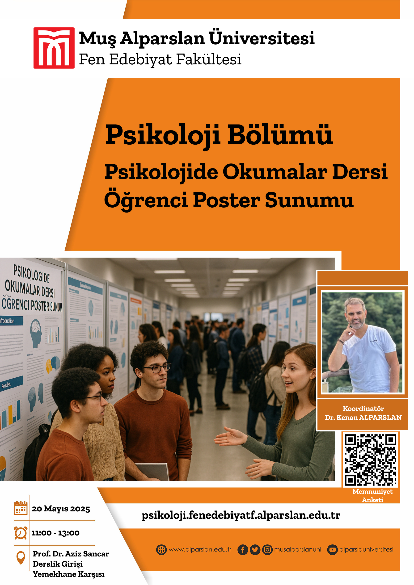 Psikoloji Bölümü 2. sınıf öğrencileri tarafından, “Psikolojide Okumalar” dersi kapsamında hazırlanan poster sunumu etkinliği 20 Mayıs 2025 tarihinde gerçekleştirilecektir.