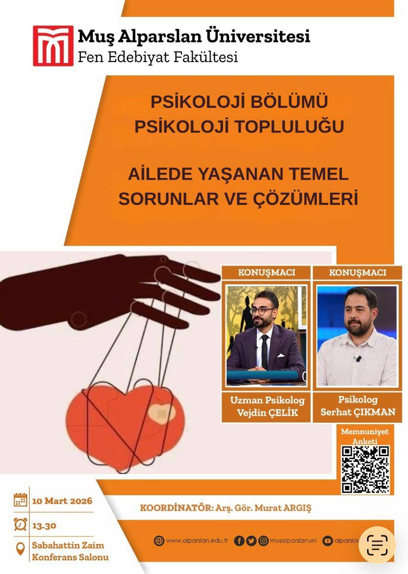 10 Mart 2026 tarihinde saat 13.30'da "Ailede Yaşanan Temel Sorunlar ve Çözümleri " isimli seminer gerçekleştirilecektir.