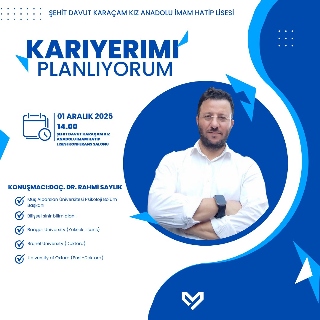Bölüm başkanımız Sayın Doç. Dr. Rahmi SAYLIK, 01.12.2025 tarihinde Şehit Davut Karaçam Kız Anadolu İmam Hatip Lisesi'nde "Kariyerimi Planlıyorum" isimli etkinliği gerçekleştirmiştir. Etkinlik kapsamında öğrencilere kariyer yolculuklarında izleyebilecekleri adımlar, meslek seçiminde dikkat edilmesi gereken noktalar ve sınav kaygısıyla başa çıkma yolları anlatıldı. Sınavlara hazırlık sürecinde etkili çalışma yöntemleri, sınav esnasında dikkat edilmesi gereken stratejiler ve motivasyonun sürdürülebilirliği üzerine bilgiler paylaşılmıştır.